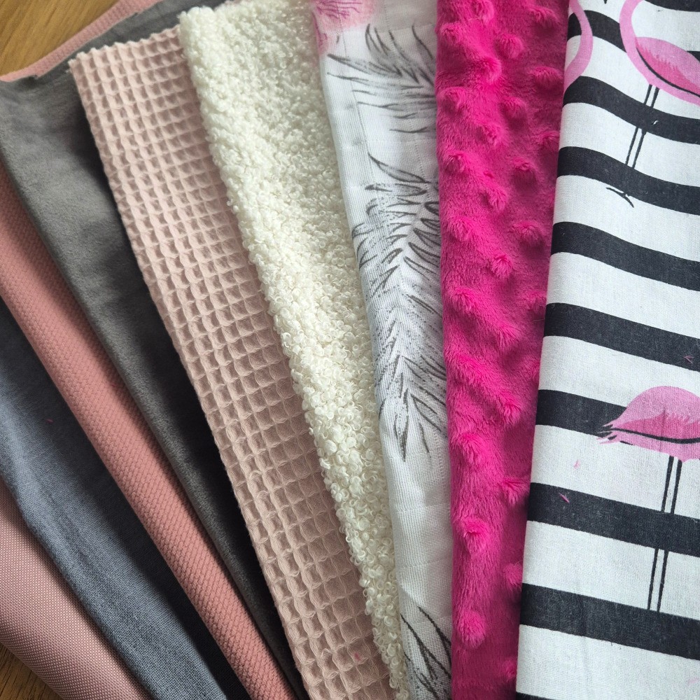 - Różnorodne rodzaje tkanin – m.in. boucle, minky, bawełna, muślin i inne