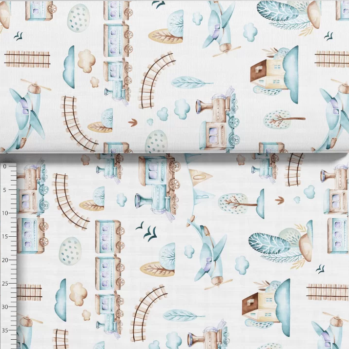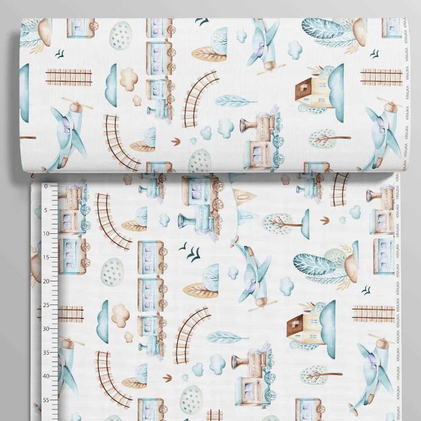 Uroczy dziecięcy motyw przedstawia mały świat pełen ruchu i przygód: ciuchcie sunące po torach, samoloty unoszące się w powietrzu, domki, drzewa oraz elementy krajobrazu. Całość utrzymana jest w harmonijnej kolorystyce błękitu, ciepłego brązu oraz stonowanego beżu na jasnym tle.